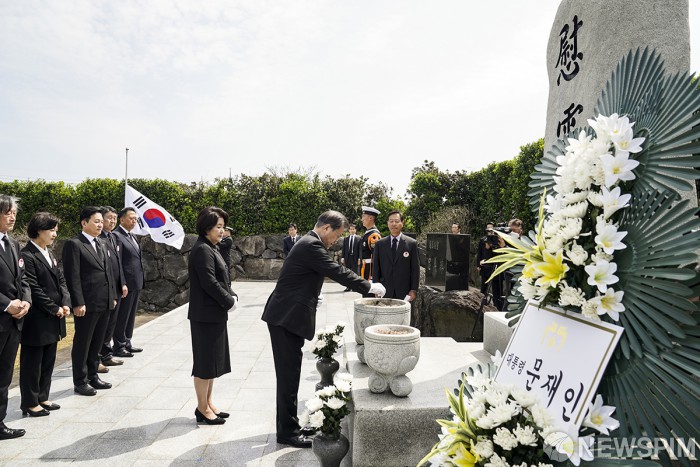 [서울=뉴스핌] 문재인 대통령과 부인 김정숙 여사가 3일 오전 제주 4·3 평화공원에서 열린 '제72주년 제주 4·3 희생자 추념식'에 참석한 뒤 4.3희생자와 군․경 신위를 한곳에 모셔 같이 위령제를 지내는 제주 애월읍 영모원을 찾아 위령단에 분향하고 있다. [사진=청와대 ] 2020.04.03 photo@newspim.com