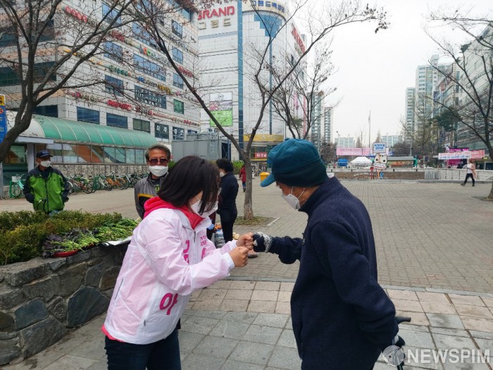 [서울=뉴스핌] 김태훈 기자 =제21대 국회의원선거(4.15 총선) 김현아 미래통합당 고양정 후보가 주엽공원에서 시민과 주먹인사를 나누고 있다. 2020.04.07 taehun02@newspim.com