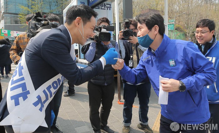 [서울=뉴스핌] 윤창빈 기자 = 김한규 더불어민주당 서울 강남구병 국회의원 후보가 7일 오후 서울 강남구 은마상가 앞에서 이인영 더불어민주당 원내대표와 주먹인사를 나누고 있다. 2020.04.07 pangbin@newspim.com