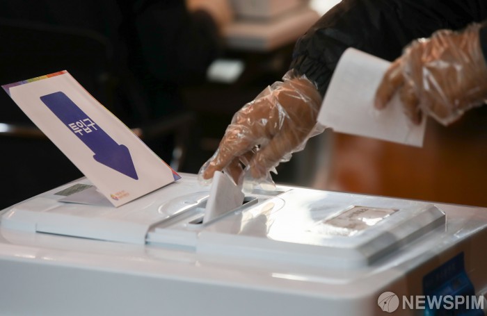 [고양=뉴스핌] 최상수 기자 = 10일 오전 경기도 고양시 덕양구청에 마련된 화정1동 사전투표소에서 시민들이 제 21대 국회의원선거 사전 투표를 하고 있다. 2020.04.10 kilroy023@newspim.com