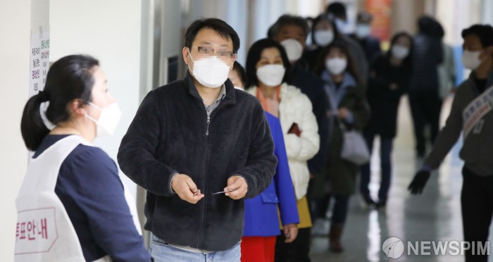 [고양=뉴스핌] 최상수 기자 = 10일 오전 경기도 고양시 덕양구청에 마련된 화정1동 사전투표소에서 시민들이 제 21대 국회의원선거 사전 투표를 하기 위해 줄을 서고 있다. 2020.04.10 kilroy023@newspim.com