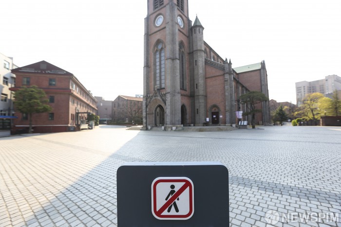 [서울=뉴스핌] 이한결 기자 = 부활대축일(부활절)인 12일 오전 코로나19 예방 조치로 미사를 중단한 서울 중구 천주교 서울대교구 명동대성당의 문이 굳게 닫혀있다. 한국천주교주교회의는 부활대축일 예식을 신자들이 참석하지 않는 가운데 가톨릭평화방송 텔레비전과 유튜브를 통해 생중계하기로 했다. 2020.04.12 alwaysame@newspim.com