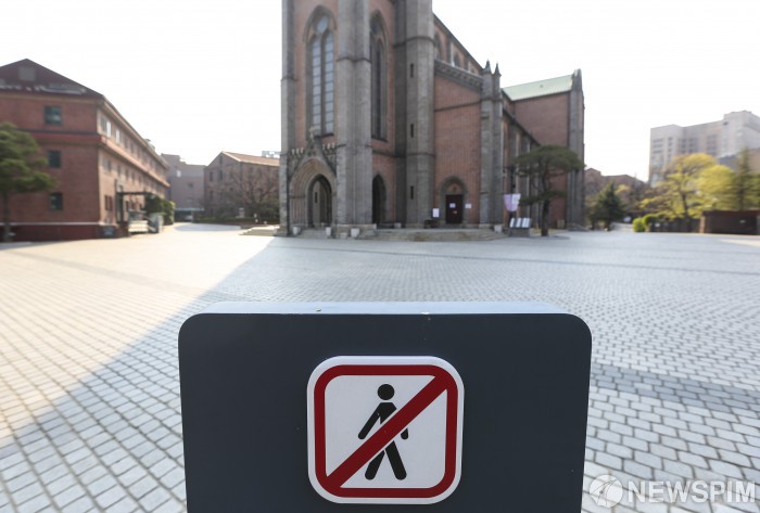[서울=뉴스핌] 이한결 기자 = 부활대축일(부활절)인 12일 오전 코로나19 예방 조치로 미사를 중단한 서울 중구 천주교 서울대교구 명동대성당의 문이 굳게 닫혀있다. 한국천주교주교회의는 부활대축일 예식을 신자들이 참석하지 않는 가운데 가톨릭평화방송 텔레비전과 유튜브를 통해 생중계하기로 했다. 2020.04.12 alwaysame@newspim.com