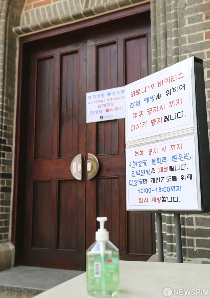 [서울=뉴스핌] 이한결 기자 = 부활대축일(부활절)인 12일 오전 코로나19 예방 조치로 미사를 중단한 서울 중구 천주교 서울대교구 명동대성당의 문이 굳게 닫혀있다. 한국천주교주교회의는 부활대축일 예식을 신자들이 참석하지 않는 가운데 가톨릭평화방송 텔레비전과 유튜브를 통해 생중계하기로 했다. 2020.04.12 alwaysame@newspim.com