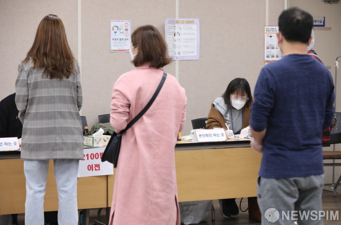 [서울=뉴스핌] 백인혁 기자 = 제21대 국회의원 선거 투표율이 오후 3시 기준 56.5%를 돌파한 15일 오후 서울 마포구 서강동 주민센터에 마련된 서강 제1투표소에서 유권자들이 투표에 앞서 본인확인을 하고 있다. 2020.04.15 dlsgur9757@newspim.com
