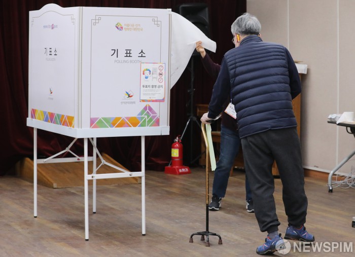 [서울=뉴스핌] 백인혁 기자 = 제21대 국회의원 선거 투표율이 오후 3시 기준 56.5%를 돌파한 15일 오후 서울 마포구 서강동 주민센터에 마련된 서강 제1투표소에서 유권자들이 투표를 하고 있다. 2020.04.15 dlsgur9757@newspim.com