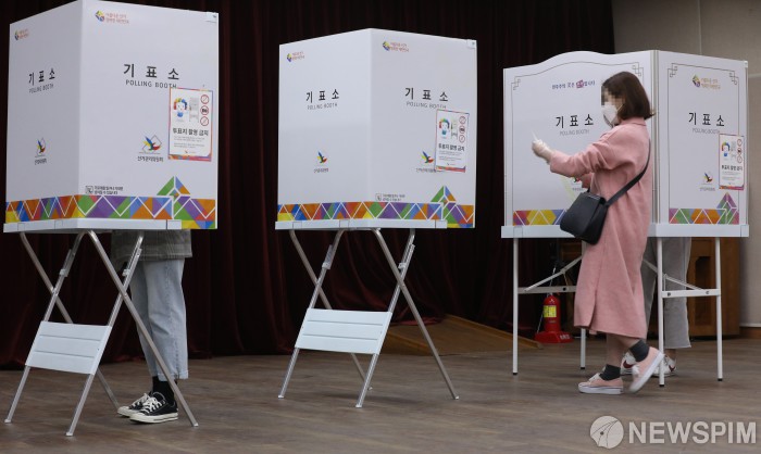 [서울=뉴스핌] 백인혁 기자 = 제21대 국회의원 선거 투표율이 오후 3시 기준 56.5%를 돌파한 15일 오후 서울 마포구 서강동 주민센터에 마련된 서강 제1투표소에서 유권자들이 투표를 하고 있다. 2020.04.15 dlsgur9757@newspim.com
