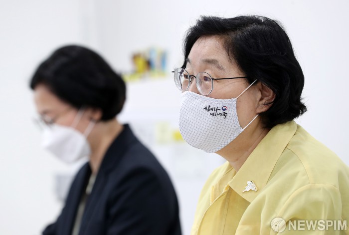 [서울=뉴스핌] 정일구 기자 = 이정옥 여성가족부 장관이 4일 오후 서울 구로구 창신모자원을 방문해 한부모와 함께하는 간담회를 갖고 있다. 2020.05.04 mironj19@newspim.com