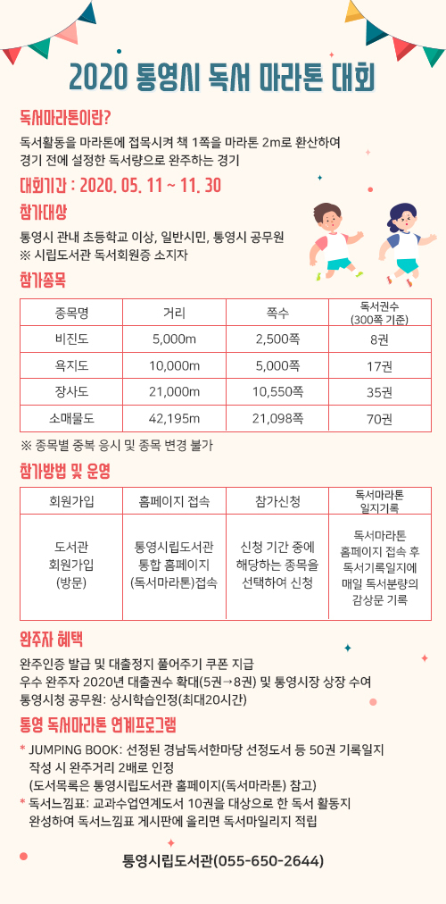독서마라톤은 책 1페이지를 마라톤 2m로 계산해 참여자가 책을 읽으며 사전에 설정한 코스를 완주하는 독서활동으로 비진도(5km-2,500쪽)·욕지도(10km-5,000쪽)·장사도(21km-10,550쪽)·소매물도(42.195km-21,098쪽)의 4개 종목으로 나누어 운영된다.