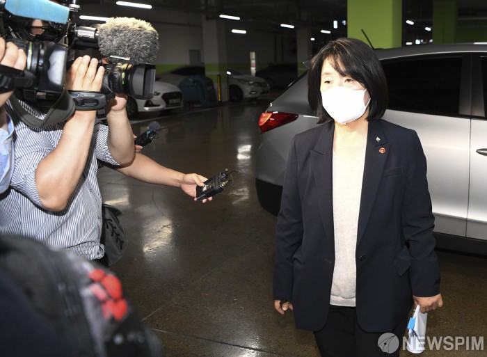 [서울=뉴스핌] 이형석 기자 = 정의기억연대(정의연) 회계 부정 의혹에 휩싸인 윤미향 더불어민주당 당선인이 잠행 열하루 만인 29일 오후 서울 여의도 국회 소통관에서 예정된 기자회견에 참석하기 위해 이동하고 있다. 2020.05.29 leehs@newspim.com