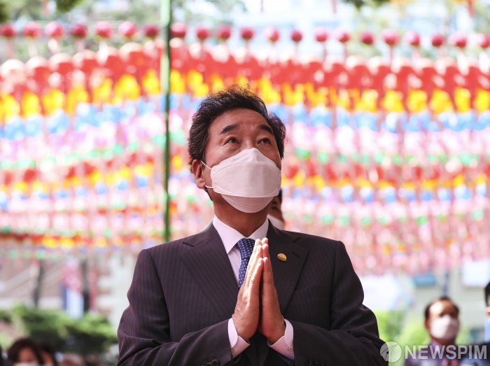 [서울=뉴스핌] 이한결 기자 = 30일 오전 서울 종로구 조계사에서 '코로나19 극복과 치유를 위한 기도 회향, 부처님오신날 법요식'이 봉행되고 있다. 이번 봉축법요식은 코로나19로 인해 지난 4월30일로부터 한 달이 연기돼 열렸다. 사진은 삼귀의례 하는 이낙연 더불어민주당 코로나19국난극복위원장. 2020.05.30 alwaysame@newspim.com