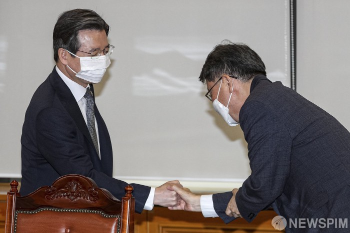 [서울=뉴스핌] 이한결 기자 = 김용범 기획재정부 제1차관(왼쪽)과 윤면식 한국은행 부총재가 2일 오전 서울 중구 은행회관에서 열린 거시경제금융회의에서 주먹인사를 하고 있다. 이번 회의에서는 코로나19 등에 따른 국내외 금융시장 동향과 실물경제 영향, 향후 대응방안 등을 점검한다. 2020.06.02 alwaysame@newspim.com