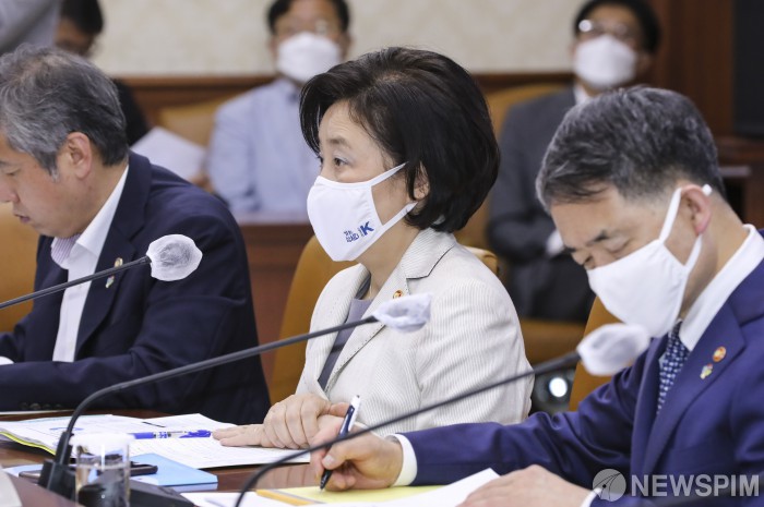 [서울=뉴스핌] 이한결 기자 = 박영선 중소벤처기업부 장관이 3일 오후 서울 종로구 정부서울청사에서 열린 제107회 국정현안점검조정회의에서 정세균 국무총리의 모두발언을 경청하고 있다. 2020.06.03 alwaysame@newspim.com
