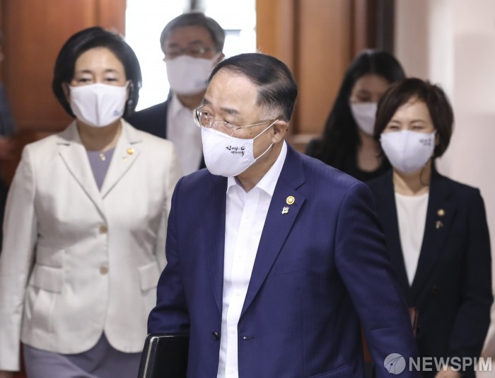 [서울=뉴스핌] 이한결 기자 = 박영선 중소벤처기업부 장관(왼쪽부터), 홍남기 부총리 겸 기획재정부 장관, 이의경 식품의약품안전처 처장이 3일 오후 서울 종로구 정부서울청사에서 열린 제107회 국정현안점검조정회의에 참석하고 있다. 2020.06.03 alwaysame@newspim.com
