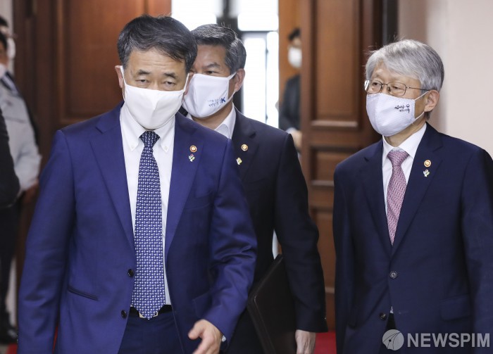 [서울=뉴스핌] 이한결 기자 = 박능후 보건복지부 장관(왼쪽부터), 정경두 국방부 장관, 최기영 과학기술정보통신부 장관이 3일 오후 서울 종로구 정부서울청사에서 열린 제107회 국정현안점검조정회의에 참석하고 있다. 2020.06.03 alwaysame@newspim.com