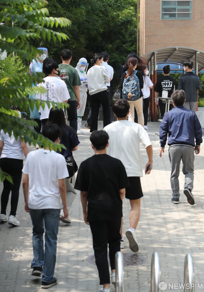 [서울=뉴스핌] 김학선 기자 = 원묵고등학교 3학년 학생이 지난 5일 잠실 롯데월드를 방문한 뒤 신종 코로나바이러스 감염증(코로나19) 확진 판정을 받은 가운데 8일 서울 중랑구 원묵고등학교에서 학생들이 코로나19 검사를 받기 위해 교내로 들어가고 있다. 2020.06.08 yooksa@newspim.com