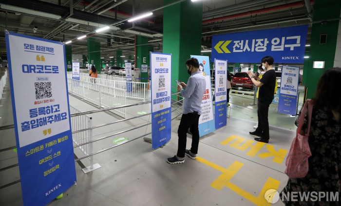[고양=뉴스핌] 정일구 기자 = 12일 오전 경기 고양시 킨텍스 제2전시관에서 열린 '2020 프리미엄 펫쇼'에서 관람객들이 신종 코로나바이러스 감염증(코로나19) 확산 방지를 위해 QR코드 전자출입명부 시스템으로 입장하고 있다. 2020.06.12 mironj19@newspim.com