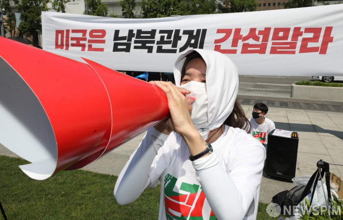 [서울=뉴스핌] 백인혁 기자 = 서울겨레하나 회원들이 13일 오후 서울 종로구 광화문광장에서 열린 '6.15공동선언 발표 20주년 기자회견'에서 미 대사관을 향해 레드카드 퍼포먼스를 하고 있다. 2020.06.13 dlsgur9757@newspim.com