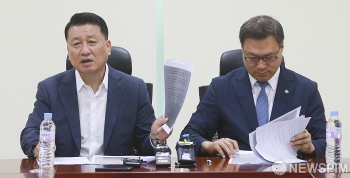 [서울=뉴스핌] 이형석 기자 = 조순열(오른쪽) 변호사와 김정기 민화협 상임이사가 23일 서울 여의도 국회 의원회관에서 김홍걸 의원의 재산상속 관련 기자회견을 열고 있다. 2020.06.23 leehs@newspim.com