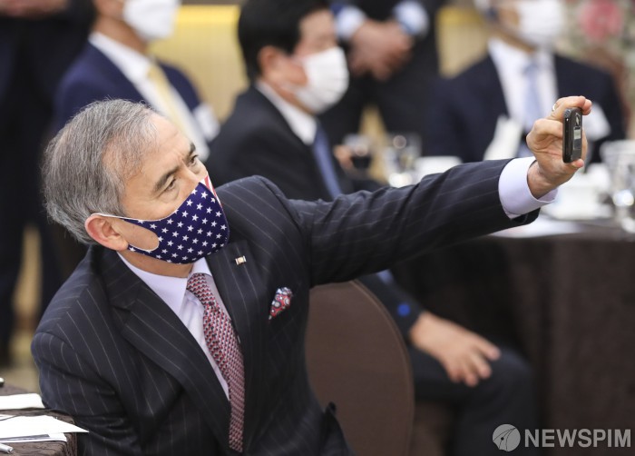 [서울=뉴스핌] 이한결 기자 = 해리 해리스 주한 미국대사가 1일 오전 서울 용산구 국방컨벤션에서 열린 제6회 한미동맹포럼에서 스마트폰으로 촬영을 하고 있다. 2020.07.01 alwaysame@newspim.com