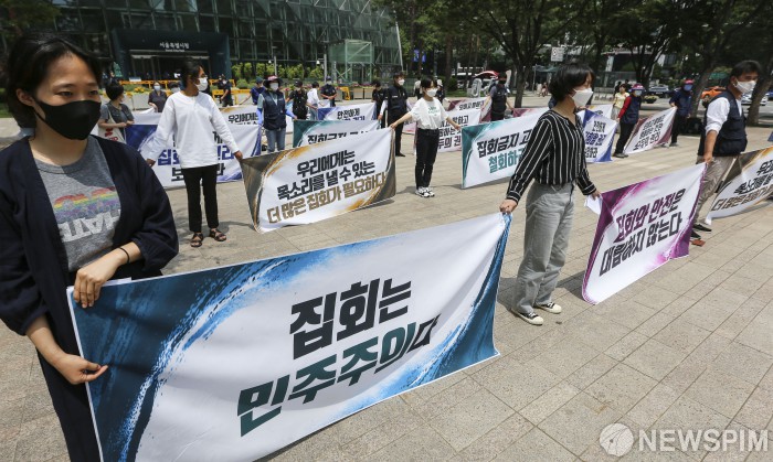 [서울=뉴스핌] 이한결 기자 = 2일 오후 서울특별시청 앞에서 열린 ‘코로나19 방역을 위한 집회 금지 규탄 기자회견에서 공공운수노동조합을 비롯한 참석자들이 현수막으로 인간띠를 이은 퍼포먼스를 펼치고 있다. 이날 기자회견에서는 고(故) 문중원 기수 추모 농성장 천막 강제철거, 코로나19 비정규직 긴급행동 집회 금지 등 주요사건을 언급하며 기본권이자 필요한 권리인 집회를 허용해야한다고 촉구했다. 2020.07.02 alwaysame@newspim.com