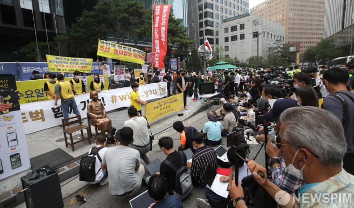 [서울=뉴스핌] 최상수 기자 = 8일 오후 서울 종로구 구 일본대사관 앞에서 기자회견 형식의 일본군성노예제 문제해결을 위한 제1447차 정기 수요시위가 열리고 있다. 2020.07.08 kilroy023@newspim.com