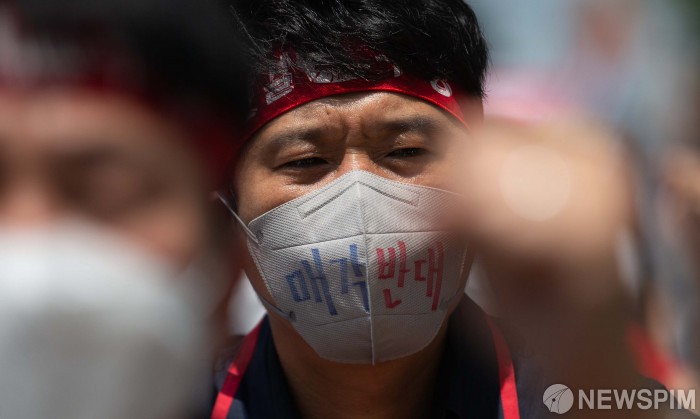 [서울=뉴스핌] 윤창빈 기자 = 대한항공노동조합 조합원들이 16일 오후 서울 강서구 대한항공 본사 앞에서 열린 기내사업부 매각 반대 투쟁 집회에서 구호를 외치고 있다. 2020.07.16 pangbin@newspim.com
