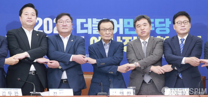 [서울=뉴스핌] 이형석 기자 = 이해찬 더불어민주당 대표(가운데)와 서정협 서울시장 권한대행(오른쪽 두번째)을 비롯한 참석자들이 22일 오전 서울 여의도 국회에서 열린 서울 예산정책협의회에서 기념촬영을 하고 있다. 2020.07.22 leehs@newspim.com
