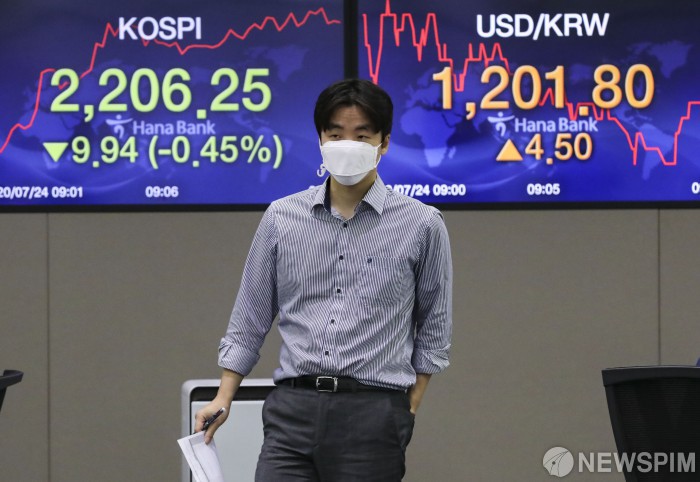 [서울=뉴스핌] 이한결 기자 = 24일 오전 코스피 지수가 전 거래일 대비 19.46포인트(0.88%) 내린 2,196.73에 개장했다. 코스닥 지수는 5.61포인트(0.70%) 내린 796.08에 출발했고 달러/원 환율은 5.2원 오른 1,202.5원에 장을 시작했다. 이날 서울 중구 하나은행 딜링룸에서 딜러들이 업무를 보고 있다. 2020.07.24 alwaysame@newspim.com