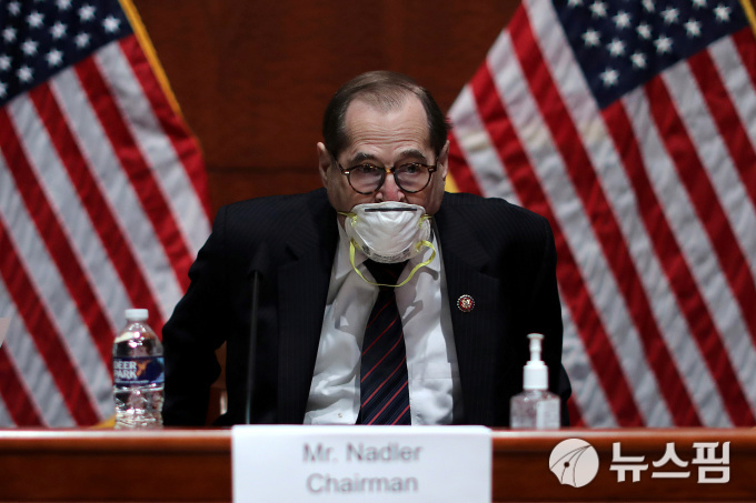 | [워싱턴 로이터=뉴스핌] 김민정 기자 = 28일(현지시간) 제리 내들러(민주·뉴욕) 하원 법사위원장이 윌리엄 바 법무장관 청문회에 참석했다. 내들러 위원장은 청문회 전 자동차사고가 났지만 다치지는 않았다. 2020.07.29 mj72284@newspim.com |