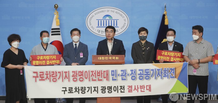[서울=뉴스핌] 이형석 기자 = 양기대 더불어민주당 의원이 31일 오전 서울 여의도 국회 소통관에서 구로차량기지 관련 민·관·정 공동기자회견을 열고 있다. 2020.07.31 leehs@newspim.com