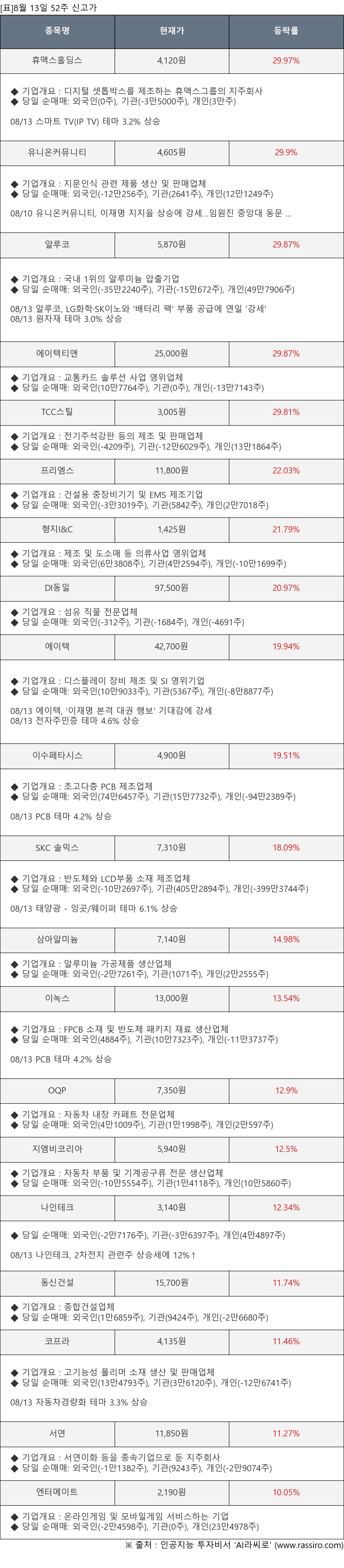 ※ 관련 종목: 휴맥스홀딩스, 유니온커뮤니티, 알루코, 에이텍티앤, TCC스틸, 프리엠스, 형지I&C, DI동일, 에이텍, 이수페타시스, SKC 솔믹스, 삼아알미늄, 이녹스, OQP, 지엠비코리아, 나인테크, 동신건설, 코프라, 서연, 엔터메이트