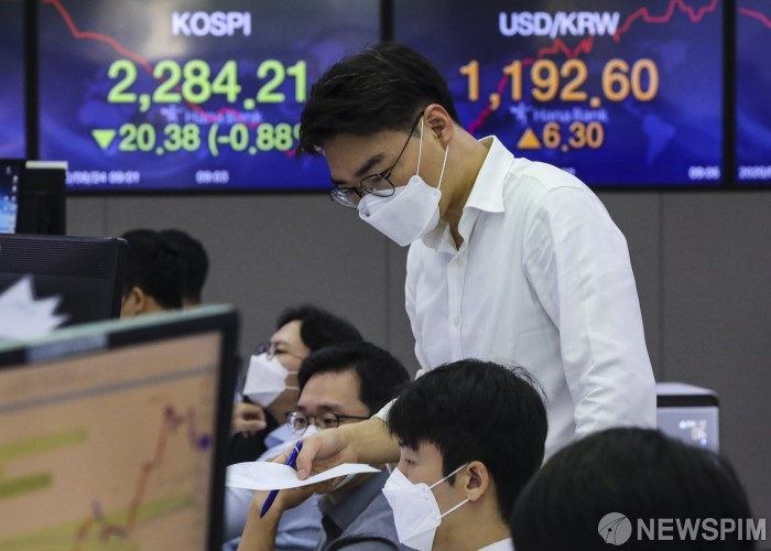 [서울=뉴스핌] 이한결 기자 = 24일 오전 코스피 지수가 전 거래일 대비 4.79포인트(0.21%) 오른 2,309.38에 개장했다. 코스닥 지수는 2.19포인트(0.28%) 오른 798.20에 출발했고 달러/원 환율은 5.2원 오른 1,191.5원에 장을 시작했다. 이날 서울 중구 하나은행 딜링룸에서 딜러들이 업무를 보고 있다. 2020.08.24 alwaysame@newspim.com