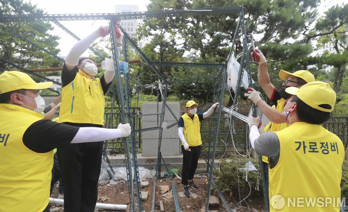 [서울=뉴스핌] 이형석 기자 = 코로나19 확산 방지를 위해 서초구가 26일 오후 서울 대검찰청 인근에 설치된 천막과 현수막에 대한 철거 행정대집행을 시행하고 있다. 2020.08.26 leehs@newspim.com
