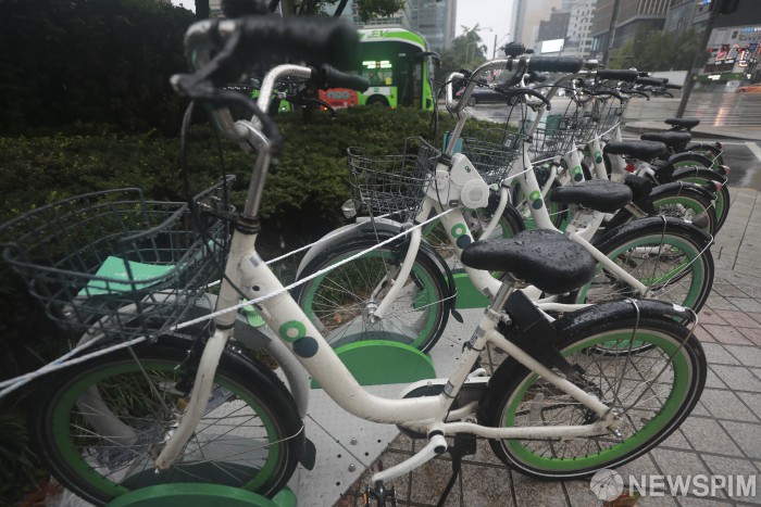 [서울=뉴스핌] 이형석 기자 = 제8호 태풍 '바비(BAVI)'의 영향으로 강한 바람과 비가 내리는 27일 오전 서울 종로구 광화문 네거리 인근에 설치된 공공자전거 따릉이가 피해를 방지하기 위해 줄에 묶여 있다. 2020.08.27 leehs@newspim.com