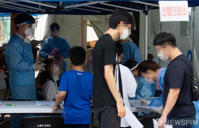 [서울=뉴스핌] 윤창빈 기자 = 28일 오전 서울 노원구 보건소에 마련된 선별진료소가 검사를 받기위해 찾은 시민들로 북적이고 있다. 이날 노원구 소재 빛가온교회에서 21명의 코로나19 확진자가 발생했다. 2020.08.28 pangbin@newspim.com