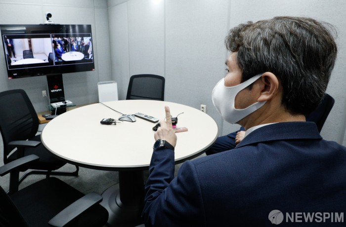[서울=뉴스핌] 정일구 기자 = 이인영 통일부 장관이 2일 오후 서울 중구 대한적십자사를 찾아 관계자로부터 이산가족 화상상봉센터에 대한 설명을 듣고 있다. 2020.09.02 mironj19@newspim.com