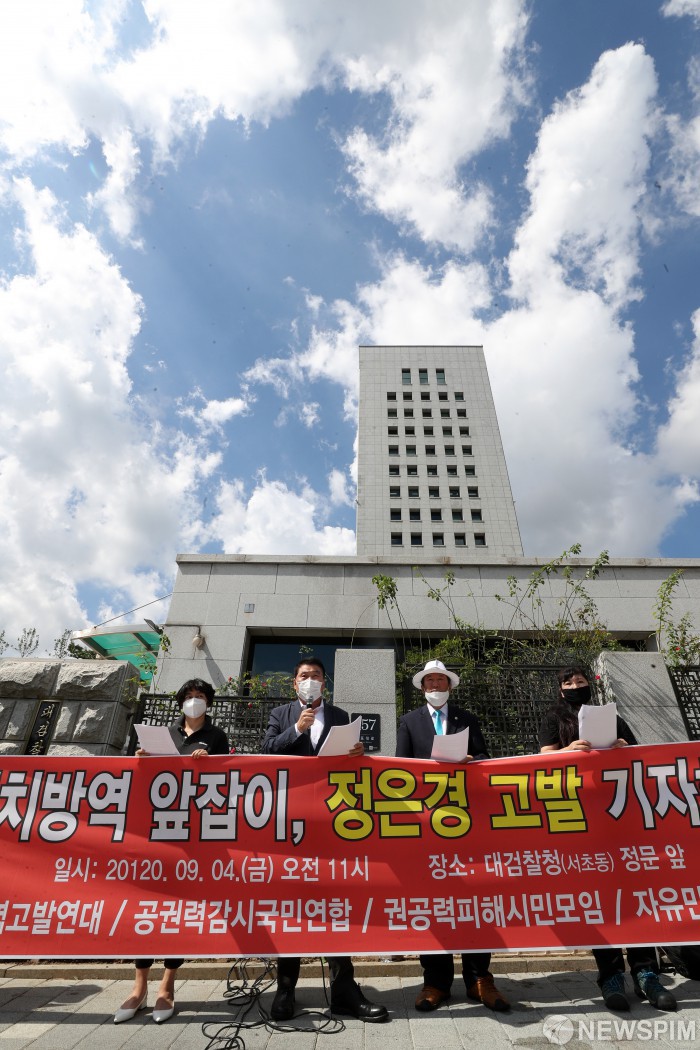 [서울=뉴스핌] 정일구 기자 = 보수단체 관계자들이 4일 오전 서울 서초구 대검찰청 앞에서 정은경 질병관리본부장 살인죄 등 고발 기자회견을 하고 있다. 2020.09.04 mironj19@newspim.com