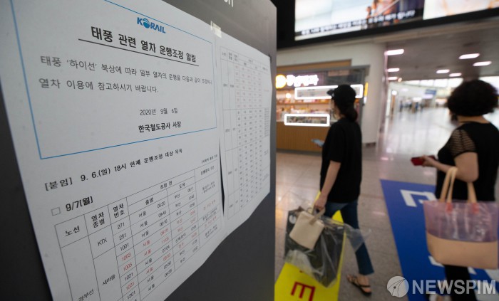 [서울=뉴스핌] 윤창빈 기자 = 7일 오후 서울 중구 서울역에 태풍 ‘하이선’ 북상으로 인해 일부 열차 운행조정을 알리는 게시물이 붙어있다. 2020.09.07 pangbin@newspim.com