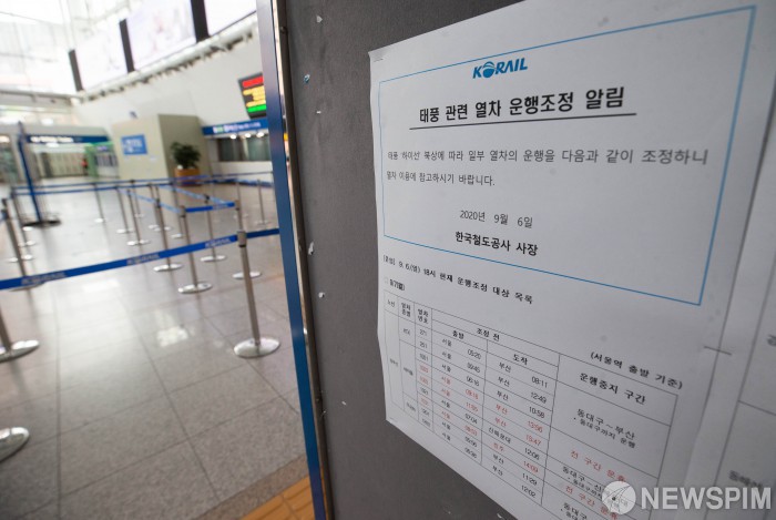 [서울=뉴스핌] 윤창빈 기자 = 7일 오후 서울 중구 서울역에 태풍 ‘하이선’ 북상으로 인해 일부 열차 운행조정을 알리는 게시물이 붙어있다. 2020.09.07 pangbin@newspim.com