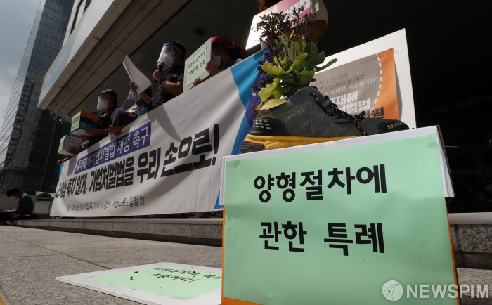 [서울=뉴스핌] 정일구 기자 = 비정규직 이제그만! 1100만 비정규직 공동투쟁 관계자들이 10일 오전 서울 중구 서울고용노동청 앞에서 중대재해기업처벌법 제정 및 국민동의 청원 비정규직 노동자의 동참 호소 기자회견을 하고 있다. 2020.09.10 mironj19@newspim.com