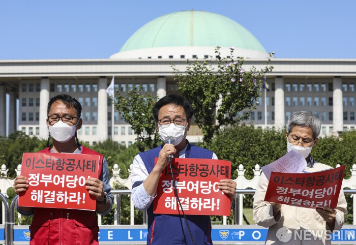 [서울=뉴스핌] 이한결 기자 = 김재하 민주노총 비대위원장이 22일 오전 서울 여의도 국회 앞에서 열린 이스타항공 720명 정리해고 사태 해결 촉구 노동시민사회 기자회견에서 투쟁발언을 하고 있다. 2020.09.22 alwaysame@newspim.com