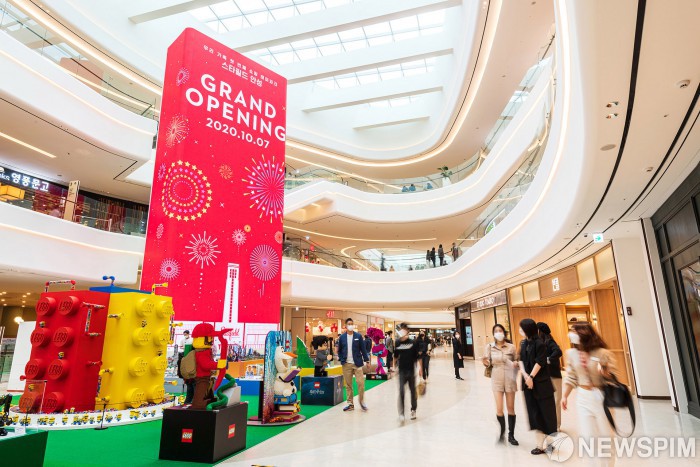 [안성=뉴스핌] 5일 오전 스타필드 안성 프리 오픈을 맞아 고객들이 스타필드 안성을 구경하고 있다. 스타필드 안성은 연면적 24만 제곱미터, 동시주차 5천대 규모를 갖춘 경기 남부 지역 최대 실내 복합 쇼핑몰로 5~6일 프리 오픈 기간을 거쳐 오는 7일 그랜드 오픈한다. [사진=신세계] 2020.10.05 photo@newspim.com