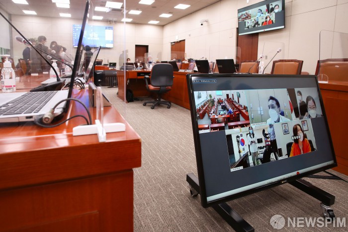 [서울=뉴스핌] 이형석 기자 = 6일 서울 여의도 국회 외교통일위원회 전체회의실에서 국정감사를 하루 앞두고 해외 공관과 화상 연결을 확인 하고 있다. 2020.10.06 leehs@newspim.com