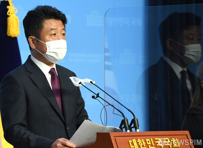 [서울=뉴스핌] 최상수 기자 = 유의동 국민의힘 의원이 8일 오전 서울 여의도 국회 소통관에서 '사모펀드 비리방지 및 피해구제 특별위원회' 현안 관련 긴급기자회견을 하고 있다. 2020.10.08 kilroy023@newspim.com