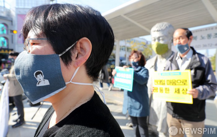 [서울=뉴스핌] 김학선 기자 = 아름다운청년 전태일50주기 범국민행사위원회가 28일 오전 서울 종로구 전태일다리에서 전태일 50주기 캠페인을 하고 있다. 2020.10.28 yooksa@newspim.com