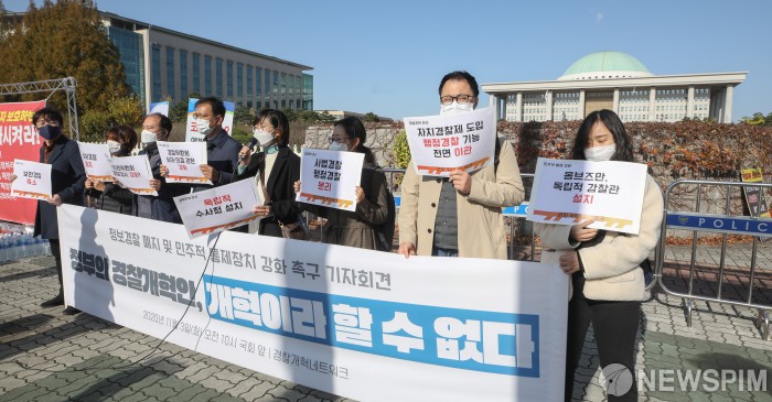 [서울=뉴스핌] 최상수 기자 = 경찰개혁네트워크가 3일 오전 서울 여의도 국회 앞에서 기자회견을 열고 정보경찰 폐지 및 민주적 통제장치 강화를 촉구하고 있다. 2020.11.03 kilroy023@newspim.com