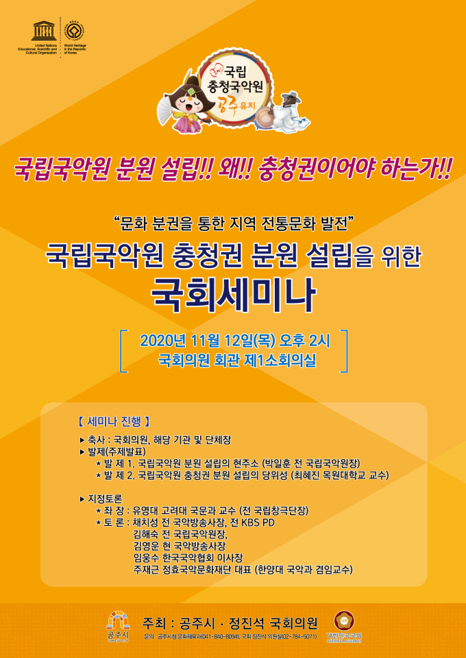 | 국립충청국악원 유치 국회세미나 포스터[사진=공주시] 2020.11.04 shj7017@newspim.com |
