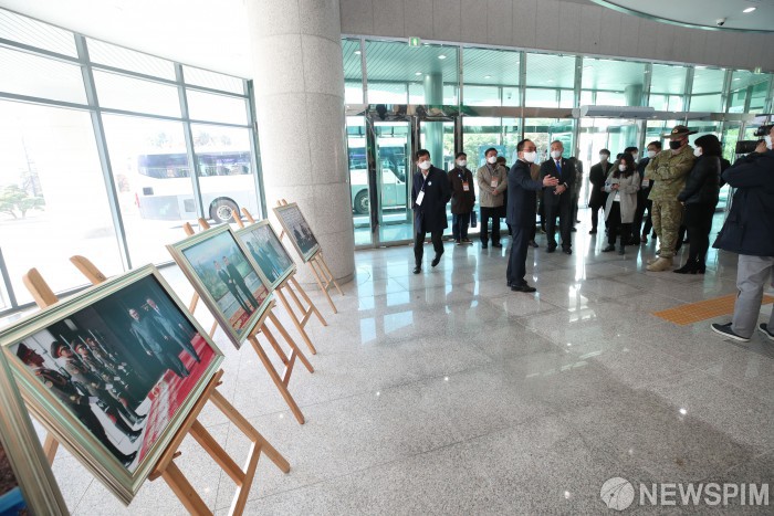 [판문점=뉴스핌] 사진공동취재단 = 판문점견학지원센터 개소식에 참가했던 시범견학단이 4일 오전 경기도 파주시 판문점 일대에서 자유의 집을 둘러보고 있다. 2020.11.04 photo@newspim.com