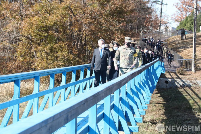 [판문점=뉴스핌] 사진공동취재단 = 판문점견학지원센터 개소식에 참가했던 시범견학단이 4일 오전 경기도 파주시 판문점 견학 코스에 포함된 도보다리를 둘러보고 있다. 2020.11.04 photo@newspim.com
